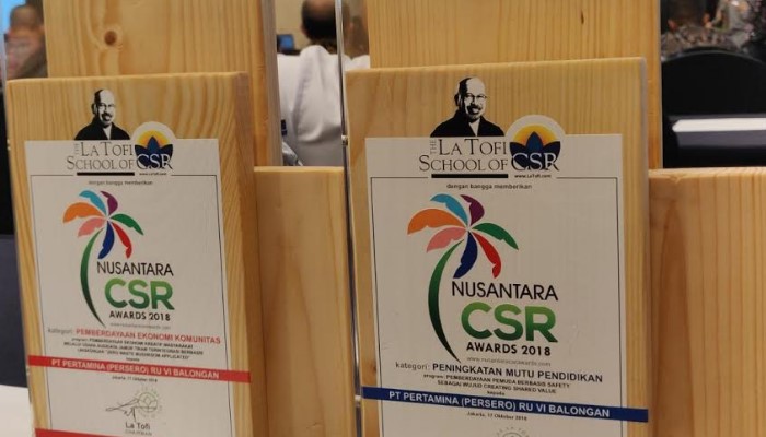 Tanganrakyat.id -Jakarta – Pertamina (Persero) Refinery Unit (RU) VI Balongan meraih penghargaan atas kinerjanya dalam implementasi program CSR. Acara Nusantara CSR Summit & Awards 2018 yang digelar di Kempinski Hotel Jakarta (17/10) memberikan penghargaan kepada RU VI Balongan untuk kategori “Pemberdayaan Ekonomi Komunitas” dan “Peningkatan Mutu Pendidikan”. Penghargaan diserahkan oleh Deputi Bidang Infrastruktur Bisnis Kementerian BUMN Hambra Samal, didampingi Chairman The La Tofi School of CSR, La Tofi, kepada GM RU VI Balongan, Burhanudin.