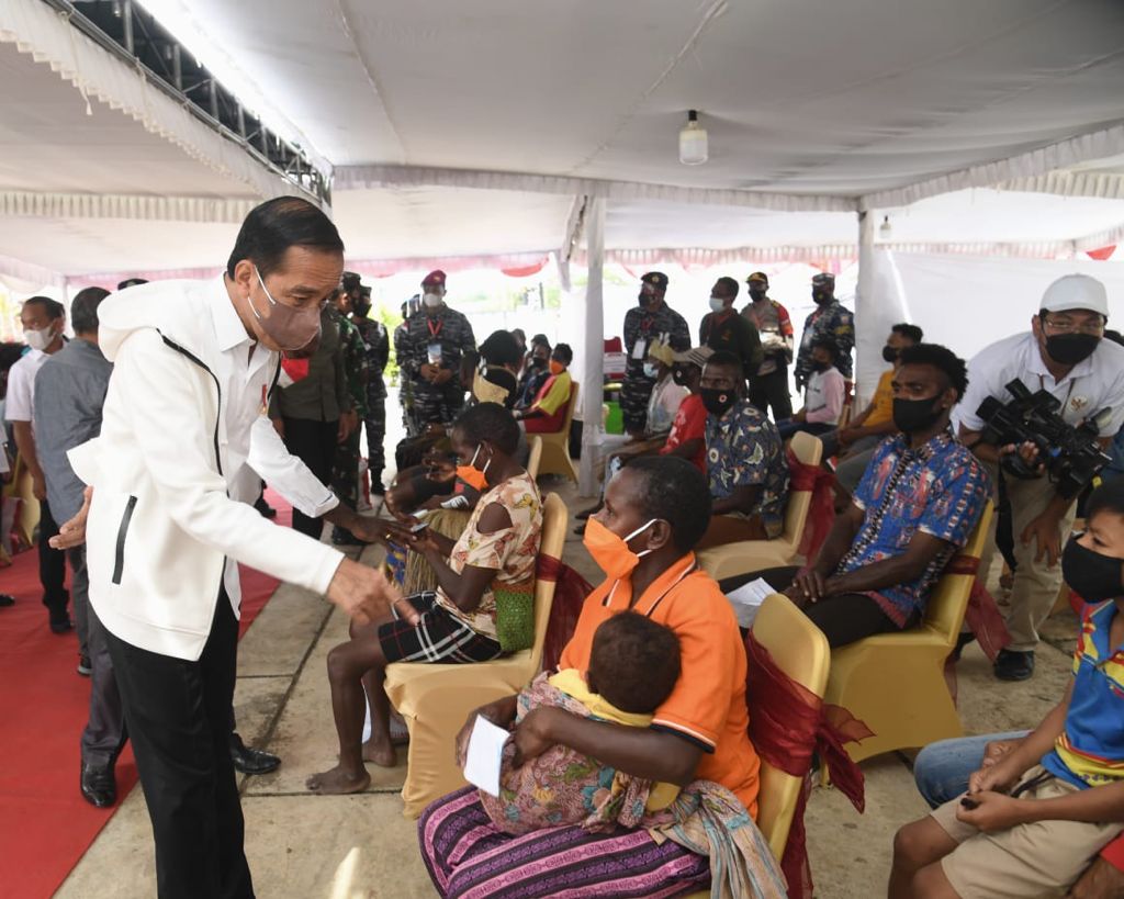 “Siang hari ini saya datang ke Kabupaten Merauke, Provinsi Papua, untuk melihat program vaksinasi yang dilaksanakan di sini. Saya ingin memastikan bahwa dari Sabang sampai Merauke pemerataan vaksin itu ada dan vaksinasi itu berjalan dengan baik,” ucap Presiden.