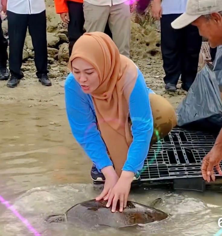 Bupati Pandeglang Irna Narulita melepas induk penyu di pantai sekitar Tanjung Lesung, Rabu 7 Juni 2023 (Foto: Disparbud Kabupaten Pandeglang)