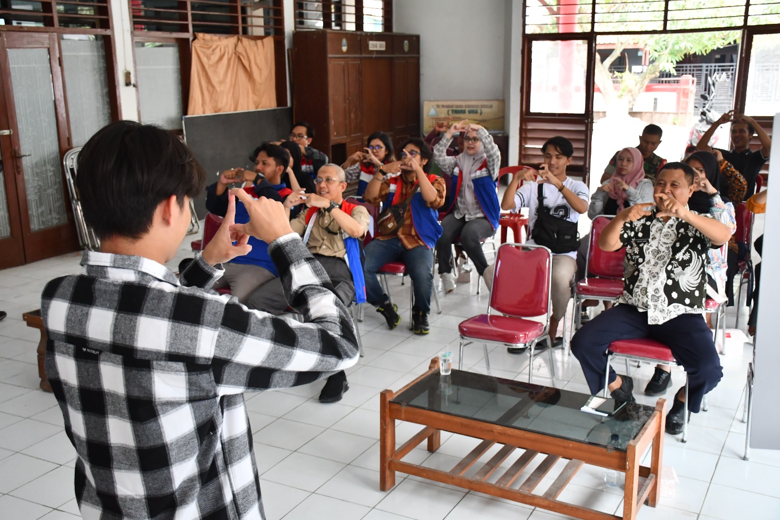 Pada pelatihan ini, hadir sebagai pemateri yakni Tarjono selaku Juru Bahasa Isyarat (JBI) Indramayu yang mengajarkan dasar-dasar BISINDO seperti huruf, angka dan kata-kata umum yang biasa dipergunakan dalam berbicara. Hadir pula pada acara ini Ketua Gerkatin (Gerakan untuk Kesejahteraan Tuna Rungu Indonesia) Indramayu Ilham Al Ghozali yang turut membantu mengajarkan praktik gerakan bahasa isyarat