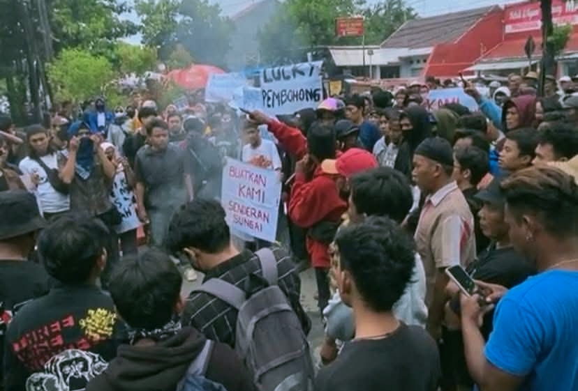 Dengan membentangkan berbagai spanduk, massa aksi menuntut pembangunan tanggul atau senderan sungai sebagai solusi permanen untuk melindungi pemukiman dari terjangan air laut yang semakin mengikis daratan.
