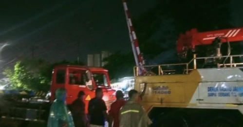 Truk trailer yang sedang menyeberang dihantam oleh KA Harina No. 100 relasi Bandung-Surabaya Pasarturi sekitar pukul 16.37 WIB.