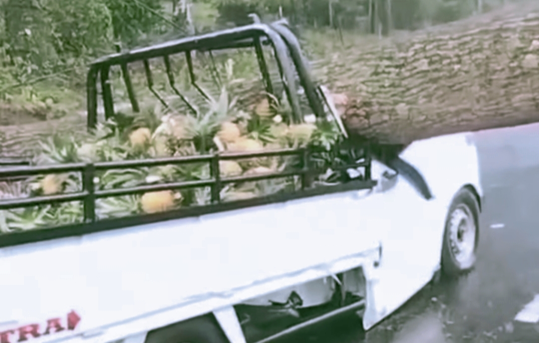 ​Pada Rabu (22/10/2025) sekitar pukul 11.30 WIB, sebuah pohon besar tumbang di Jalan Raya Nagrog, Desa Palasari, Kecamatan Ciater, dan langsung menimpa mobil bak terbuka bermuatan nanas.