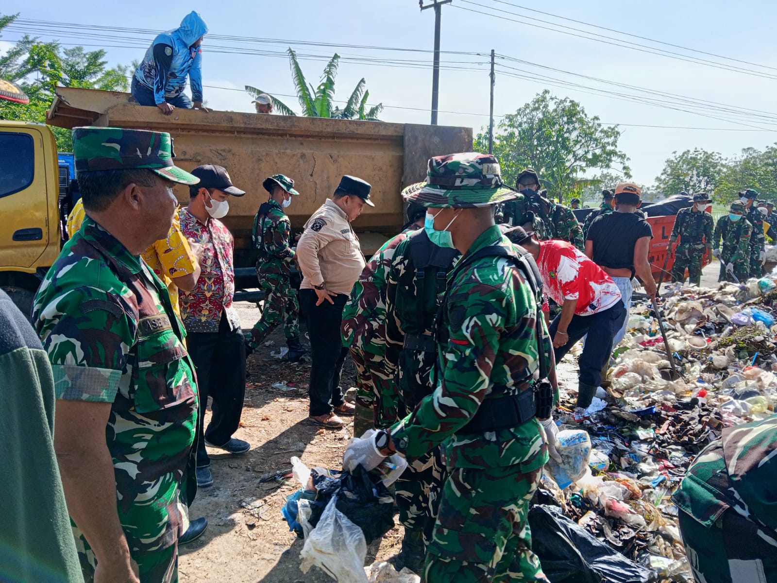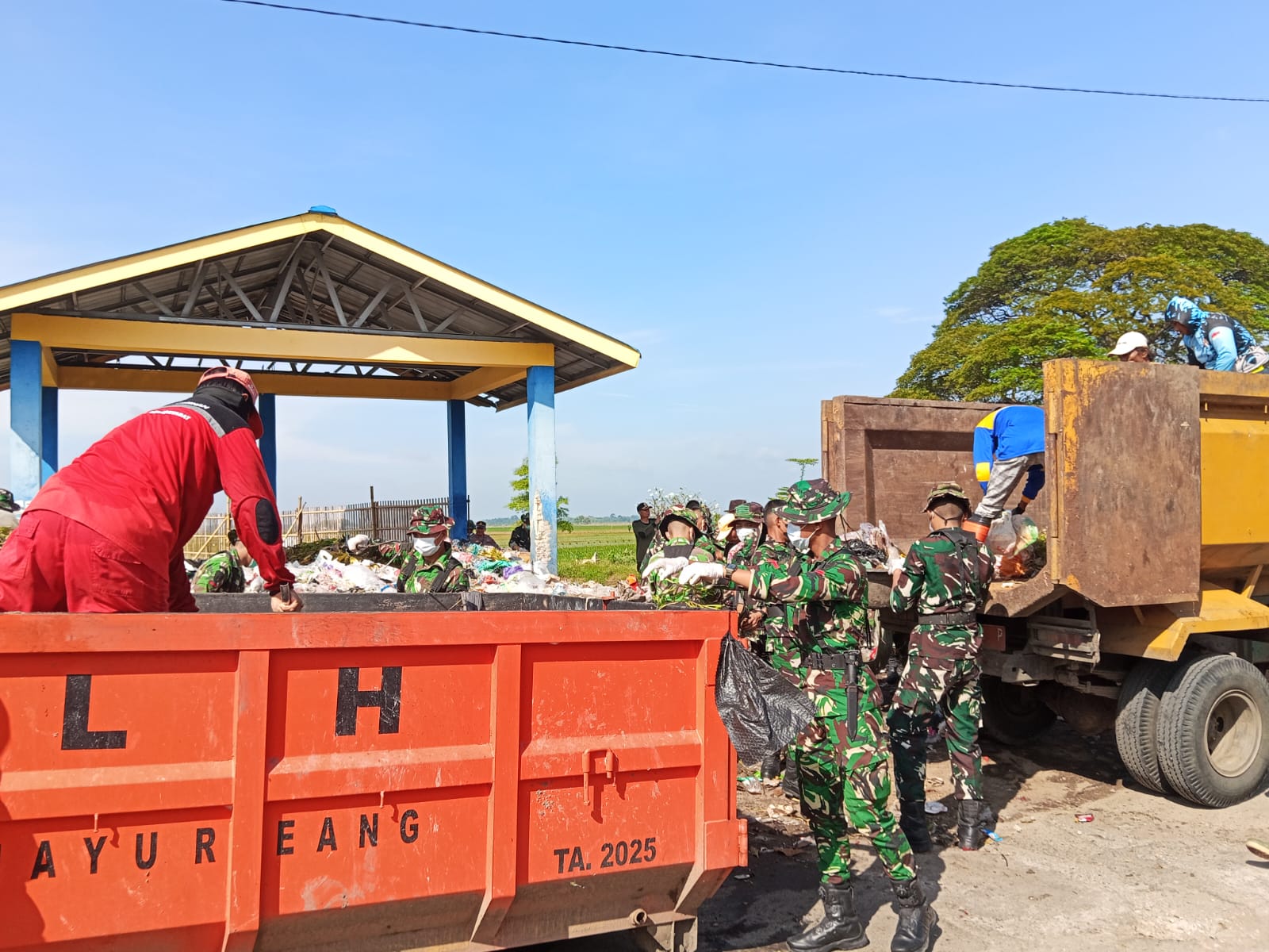 Dengan semangat kemanunggalan, para petugas bahu-membahu mengangkut tumpukan sampah menggunakan armada dari UPTD Kebersihan Losarang agar kondisi lingkungan kembali sehat dan asri.